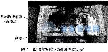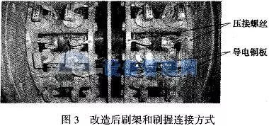 (2)拆下刷座,按原刷握分布位置,在刷座正、负导电板上绞孔攻丝32个,然后将碳刷外引线直接压接在导电铜板上,刷握只起固定碳刷的作用(图3),这样直流电流不经过刷握与刷座接触面,直接由滑环经碳刷流入导电板。